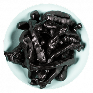 | Ingredienser | Sukker, glukosesirup, gelatine, vand, ammoniumchlorid (2, 1%), lakridsekstrakt (1, 7 %), farvestof: (E153), aromaer. |