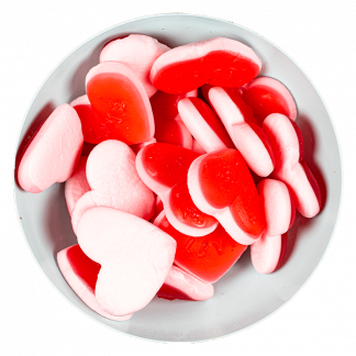 Sukker, glukose-fruktosesirup, hvedemel, modificeret majs- og kartoffelstivelse, helt hærdet vegetabilsk fedt (palmekerne, kokos), fugtighedsbevarende middel (glycerol), emulgator (mono- og diglycerider af fedtsyrer), fortykningsmiddel (arabisk gummi), syre (æblesyre), salt, farvestoffer (carmin, curcumin), aromaer, vegetabilsk olie (palme, palmekerne, kokos), overfladebehandlingsmiddel (carnaubavoks), antioxidant (ascorbinsyre)